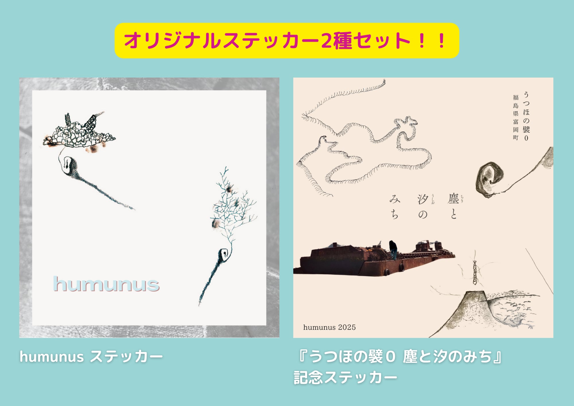humunusステッカーと、『うつほの襞0 塵と汐のみち』記念ステッカーの、あわせて2種セットでお届け。